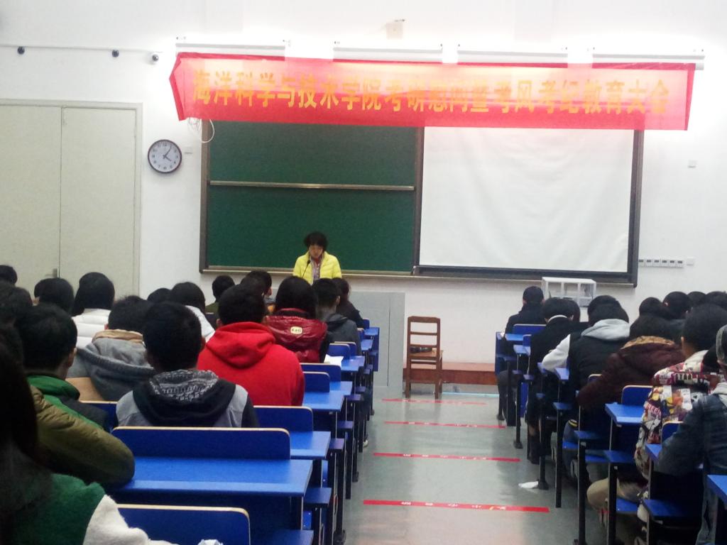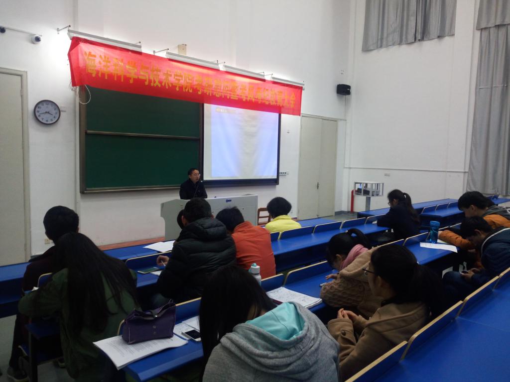 2016年12月13日,海洋科学与技术学院考研慰问暨考风考纪教育大会于教学楼119隆重举行,会议由学工办主任楼林燕老师主持。