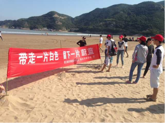 一到露营大会现场,绿舟环保协会的队员们就在会长张依莎的带领下,早早地将“带走一片白色,留下一片蔚蓝”的环保宣传横幅悬挂在醒目位置,并积极向广大参赛队伍和游客宣传海洋环保知识和理念。另一方面,全体志愿者积极配合组委会的现场工作人员,一部分志愿者负责维持现场秩序,一部分志愿者则协助参加者、游客等搭建帐篷和睡袋,另一部分则及时清理沙滩现场的垃圾,保持活动场地的环境卫生。