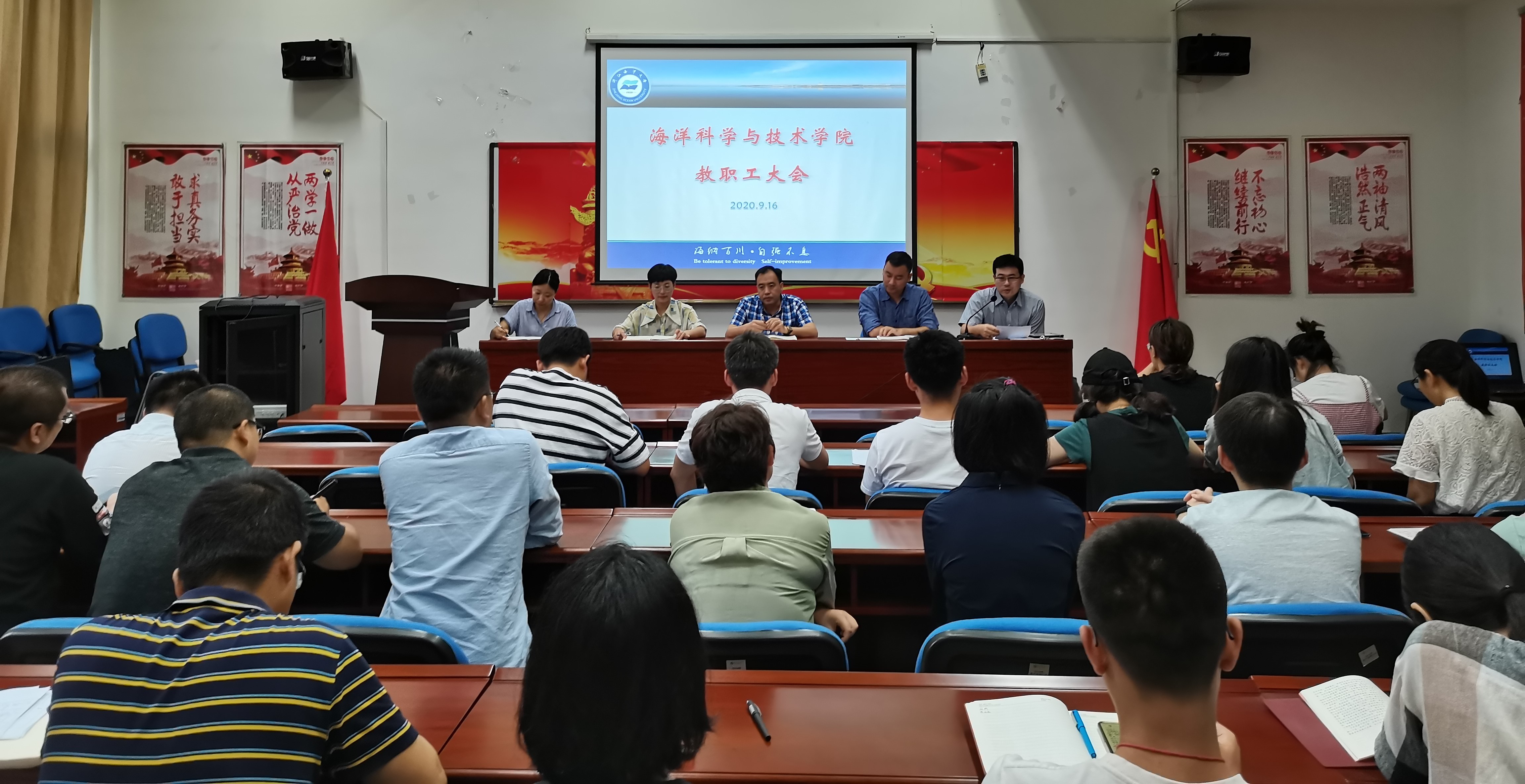 9月16日下午,海洋科学与技术学院在海科楼141会议室召开2020—2021学年第一学期初教职工大会。学院党委书记、院长王健鑫,副院长王天明,党委副书记、纪委书记何桂明,院长助理桂峰,院长助理李博及全体教职工参加会议。会议由王健鑫院长主持。