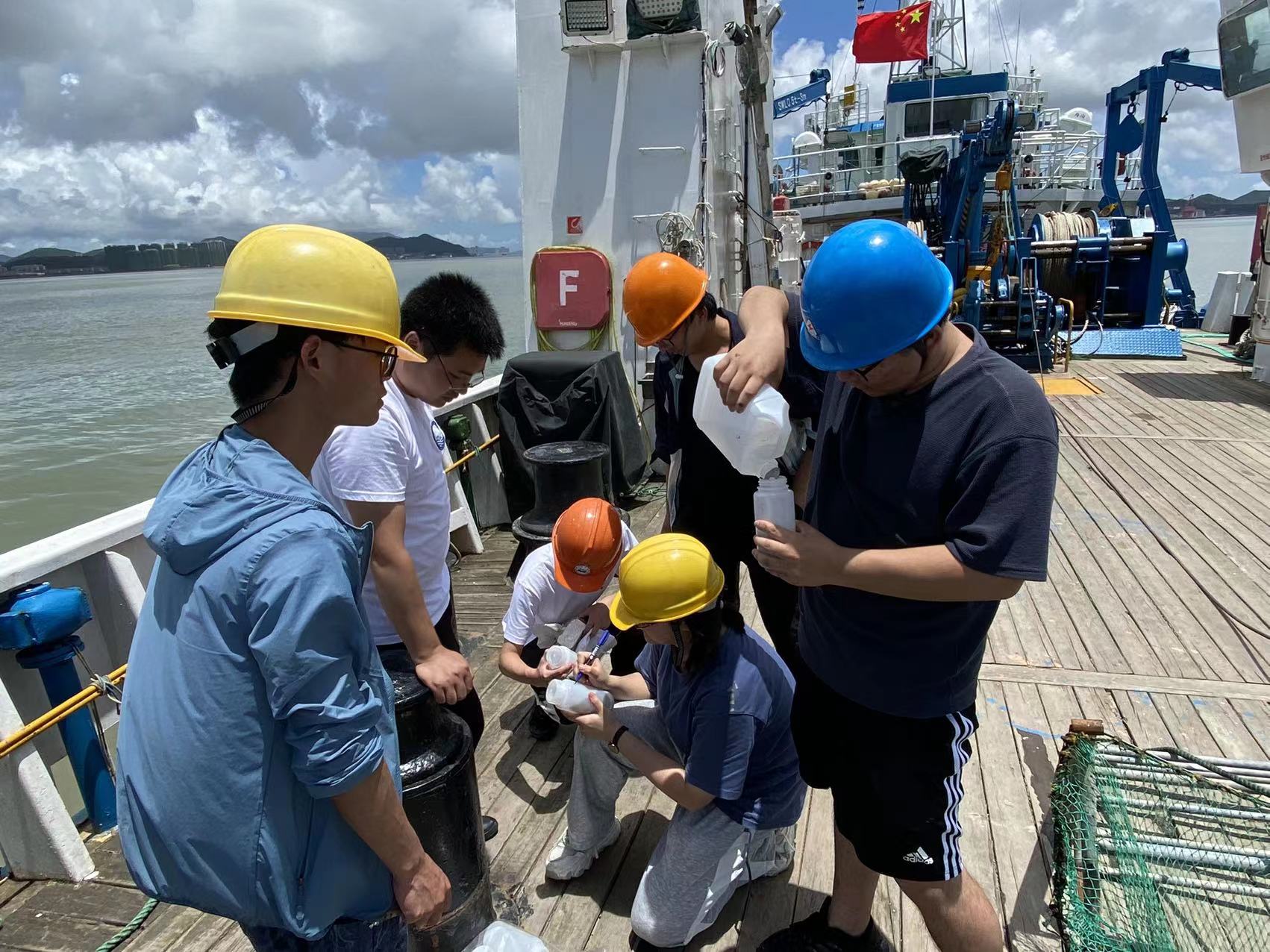 海上综合调查由“浙渔科2号”科考船承担,以舟山群岛南部海域为主要观测研究对象,共设置5个站位,其中包括4个大面站和1个连续站,同学们实地学习操作各种测量仪器,现场掌握各项数据的测量方法,包括风速、风向、海温、盐度、流速、流向、透明度和水色等水文数据;浮游生物、底栖生物、和微生物等生物指标以及溶解氧、pH、总碱度、亚硝氮和可溶性磷等化学数据。
