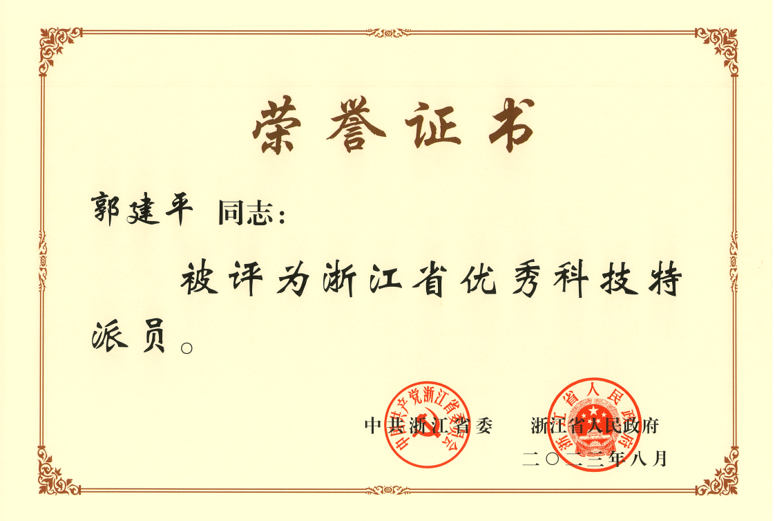 郭建平副教授在科技扶贫工作中的突出成就,多次被浙江卫视、黄岩媒体等媒体报道,先后被评为2005-2006年度省优秀科技特派员、2007-2008年度省优秀科技特派员和2016-2017年度省优秀科技特派员,并在2023年浙江省科技特派员二十周年工作总结及评优中,被评为浙江省优秀科技特派员。