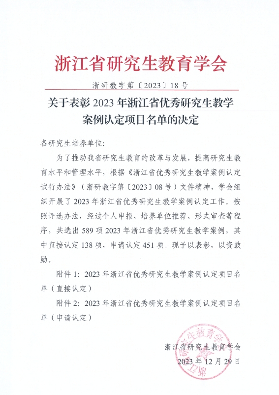 近日,浙江省研究生教育学会发文公布了2023年浙江省优秀研究生教学案例认定名单,澳门彩 朱文卓老师撰写的《海水富营养化》案例获批认定。本次教学案例的成功入选,不仅说明澳门彩 对研究生教育教学的重视,更展示了研究生教育教学的成果。今后,学院将会持续贯彻落实全国研究生教育会议精神,革故鼎新、追求卓越,持续深化研究生教育综合改革,不断提高澳门彩 研究生培养质量。