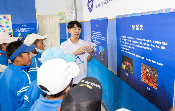 接着,科普团为了让孩子们真切感受到海洋生物,带来了亲手制作的不同种类的螃蟹等标本,还将制成标本的大型鱼类、海龟等带到了课堂,让远在高原的孩子们亲手触摸、感受到海洋生物的魅力!