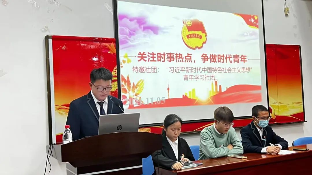 社团成员以“关注时事热点,争做时代青年”为题,从经济,安全,生态,科技发展等多方面出发展开宣讲。首先,社团成员向澳门彩