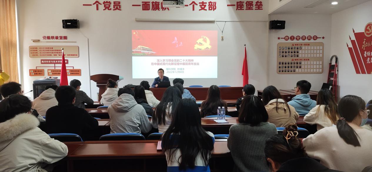 党委书记林增丰以《深入学习领会党的二十大精神 在中国式现代化新征程中展现青年担当》为题,为学院3个研究生党支部41名党员宣讲党的二十大精神。